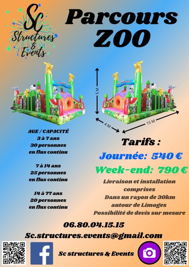 Le Parcours Zoo est une immense structure gonflable (15 × 4 × 5 m) pour les enfants de 3 à 7 ans, jusqu’à 30 participants en flux continu, pour une aventure pleine d’animaux et de rebondissements.